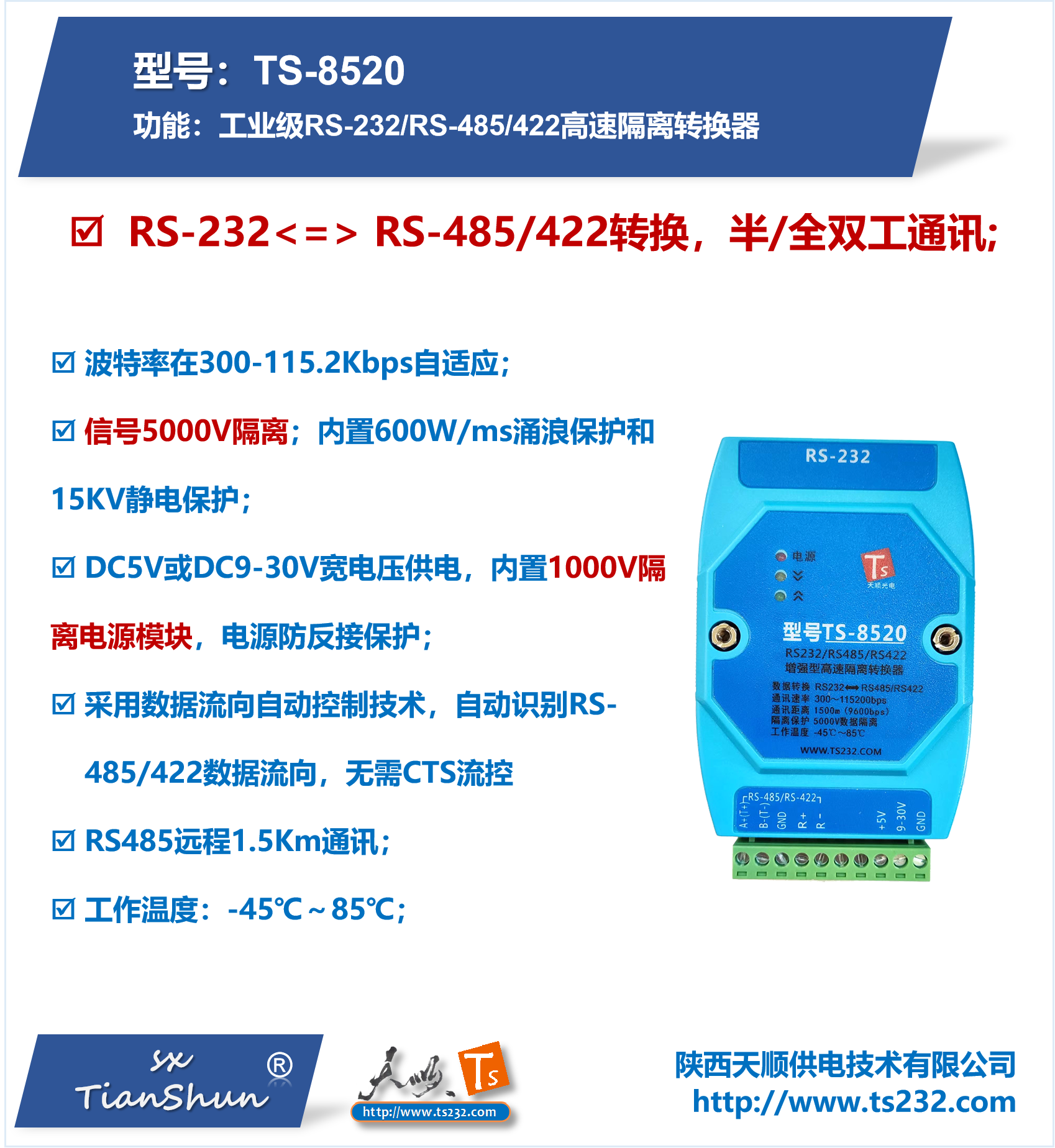 TS-8520C是将RS-232通信接口转换成两线制半双工RS-485接口或四线制全双工RS-422接口;串口窃电,无需外供电源;独有串口保护电路,可带电热插拔;智能流向控制,零延时自动转发。